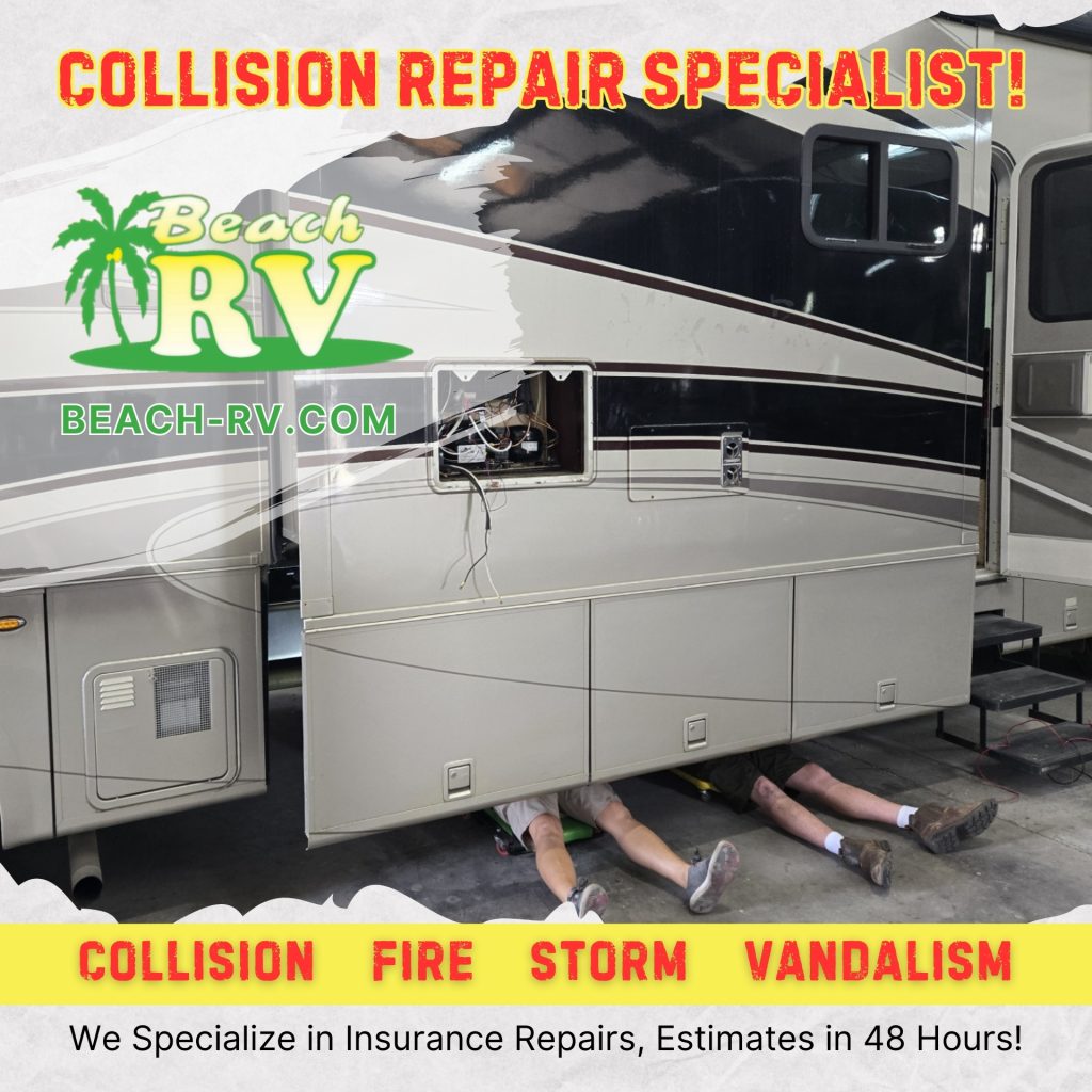 Beach RV is your collision, storm, and fire damage experts. Our technicians have over 80 years of combined experience and are master certified by The National RV Dealers Association or The Recreation Vehicle Industry Association